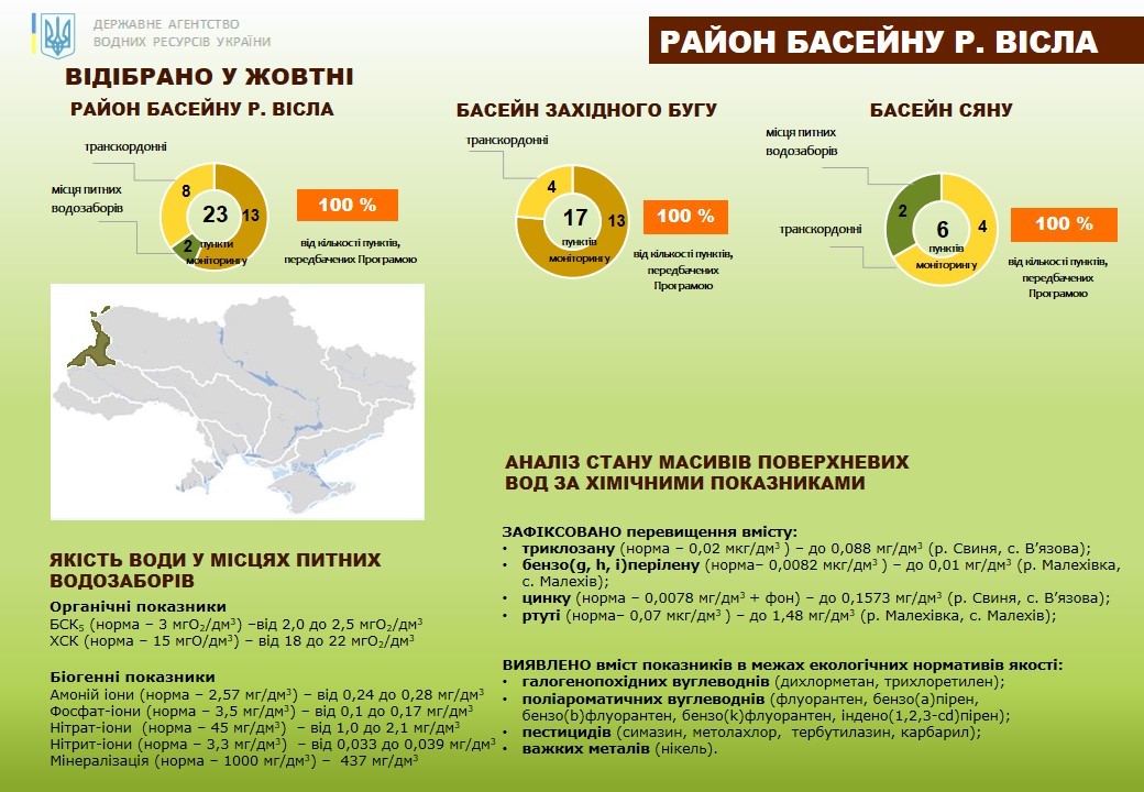 У жовтні 2025 р. проведено моніторинг якості поверхневих вод на 23-х затверджених пунктах спостережень в межах української частини басейну р. Вісли (у т. ч. на 17-ти створах суббасейну Західного Бугу і на 6-ти – в межах суббасейну Сяну). Аналізи якості води включали визначення фізико-хімічних та хімічних показників якості води (у т. ч. вмісту органічних і біогенних речовин, пестицидів, важких металів, поліароматичних і галогенованих вуглеводнів, алкілфенолів, трихлорбензолів, медикаментів).