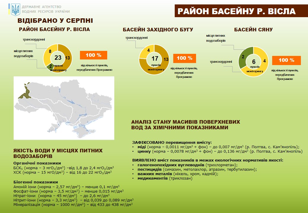 У липні 2025 р. проведено моніторинг якості поверхневих вод на 23-х затверджених пунктах спостережень в межах української частини басейну р. Вісли (у т. ч. на 17-ти створах суббасейну Західного Бугу …